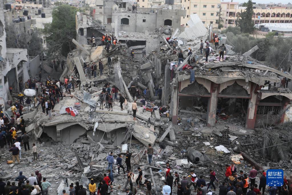 11月22日,人們在加沙地帶南部城市拉法的建筑廢墟上實施救援。