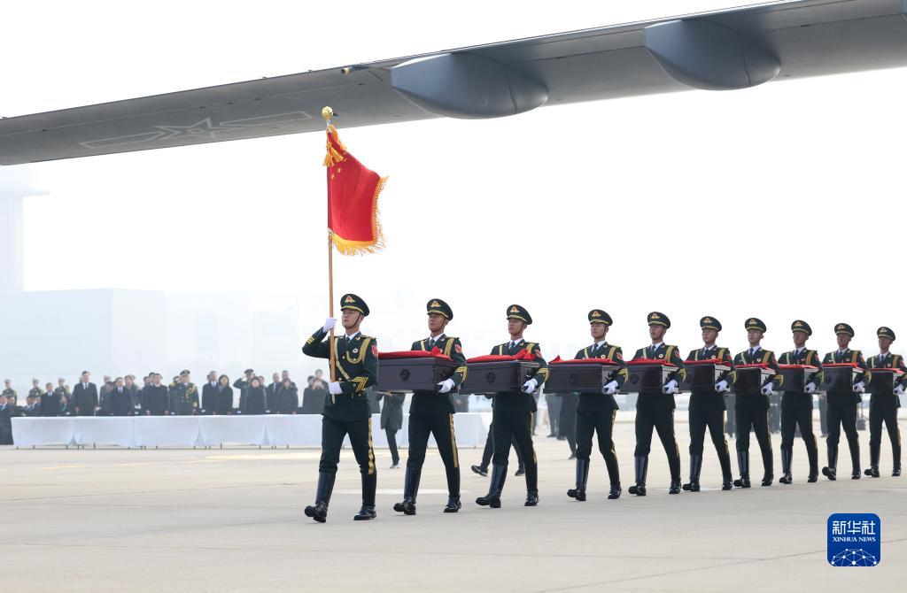 11月23日上午,中韓雙方在韓國仁川國際機場共同舉行在韓中國人民志愿軍烈士遺骸交接儀式。中韓雙方代表現場簽署交接書,確認交接25位在韓中國人民志愿軍烈士遺骸及相關遺物。