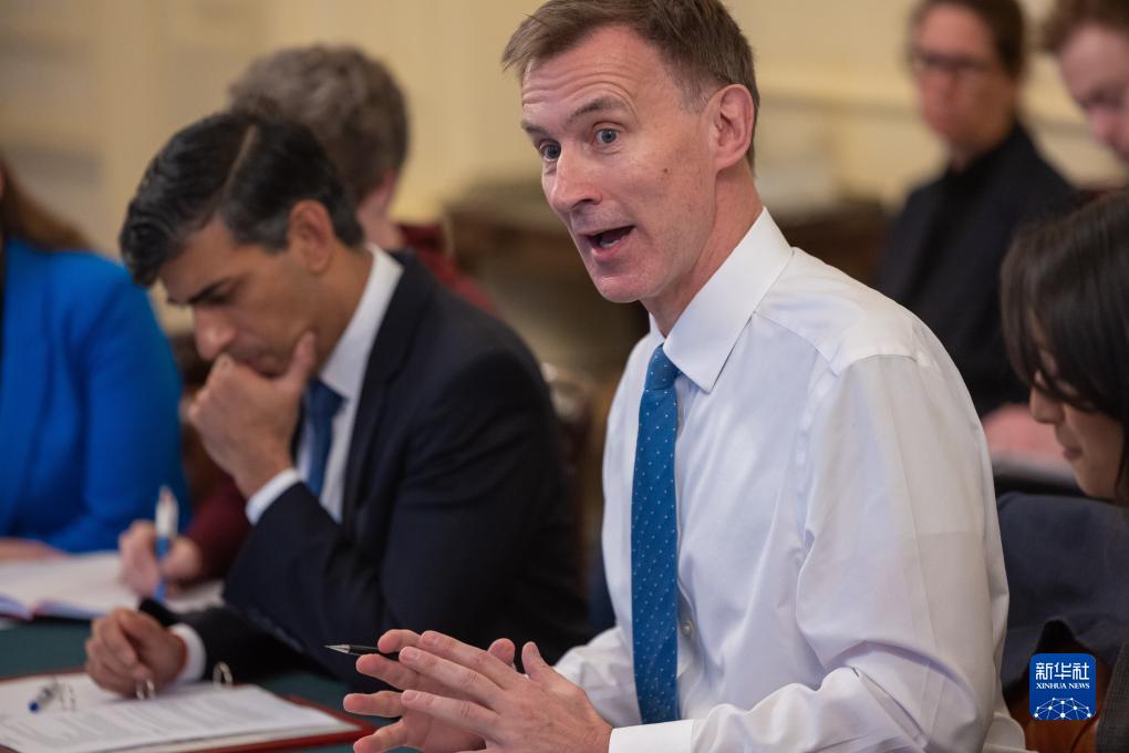 11月22日,在英國倫敦,英國財政大臣杰里米·亨特(右)在公布秋季預算案前舉行的內閣會議上發言。