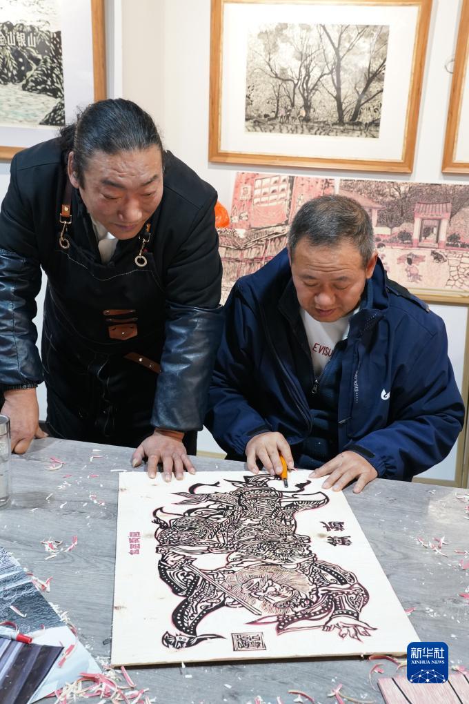 11月22日,旬陽市版畫院院長蔚世生(左)在指導農民版畫合作社社員刻版創作。