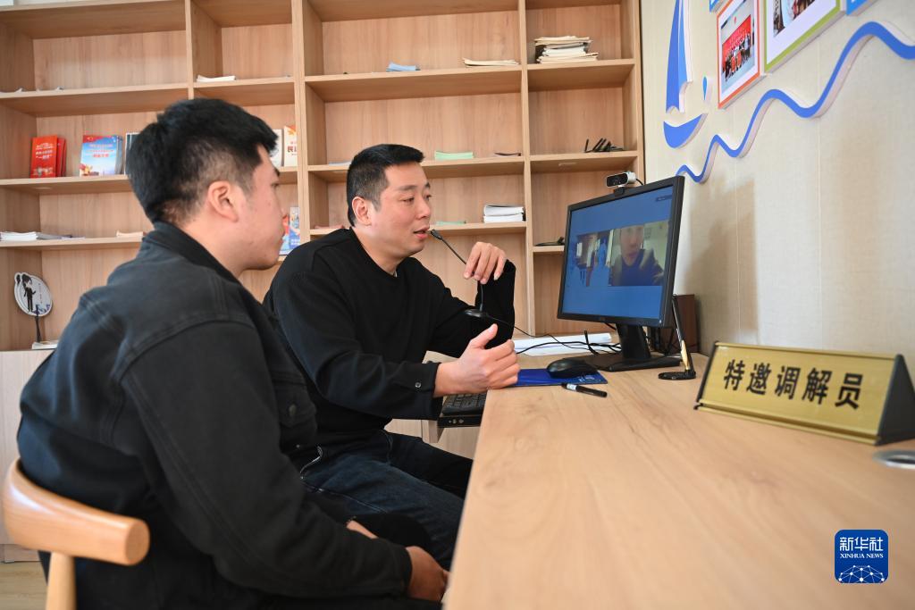11月18日,在福建省寧德市霞浦縣溪南鎮七星海上社區訴非聯動中心,霞浦縣法院特邀調解員(右)為漁民飼料款拖欠糾紛進行視頻連線調解。