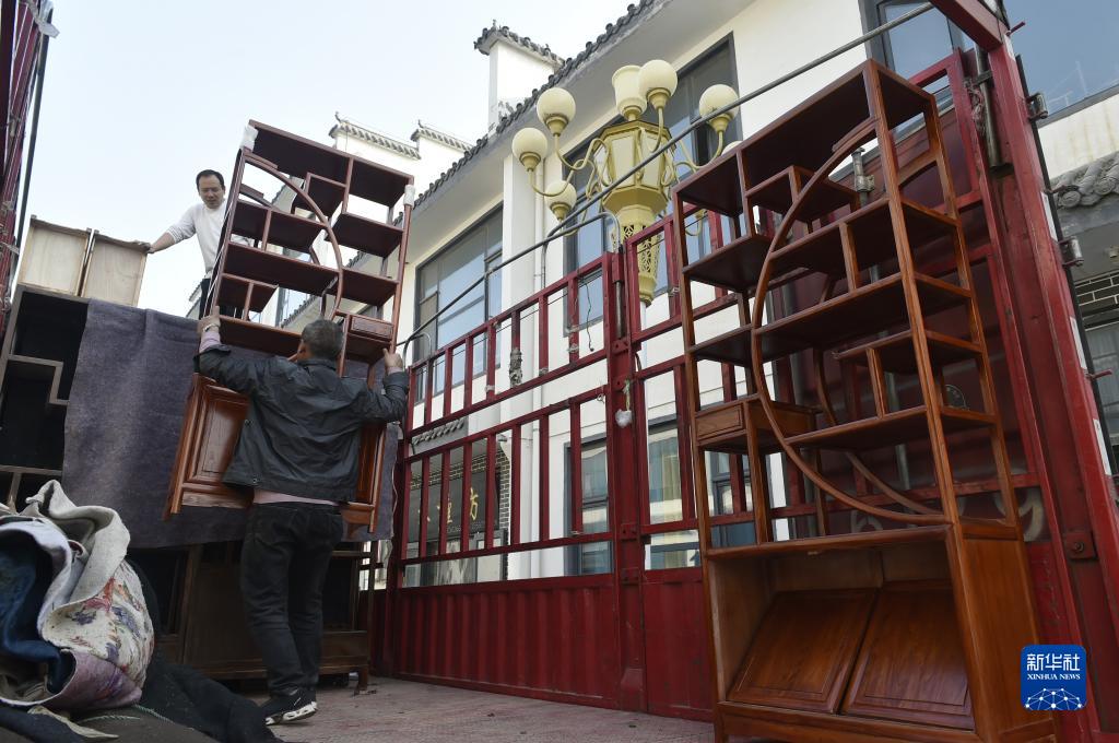 11月22日,在滑縣半坡店古典家具特色小鎮,商戶在搬運家具準備裝車外銷。