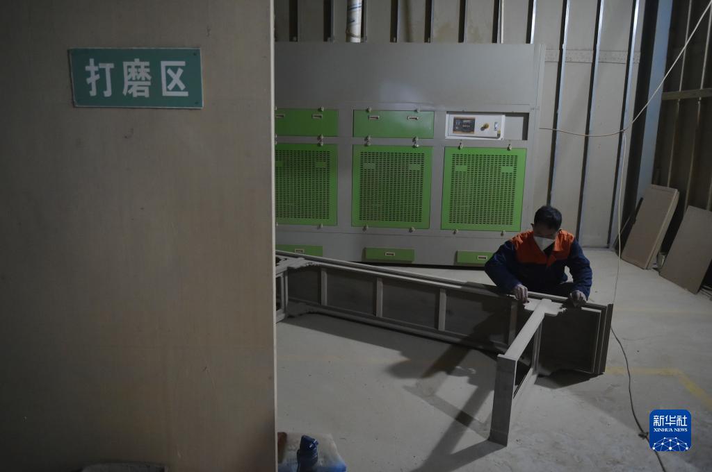 11月22日,工人在滑縣半坡店古典家具特色小鎮內一家企業的生產車間打磨家具。