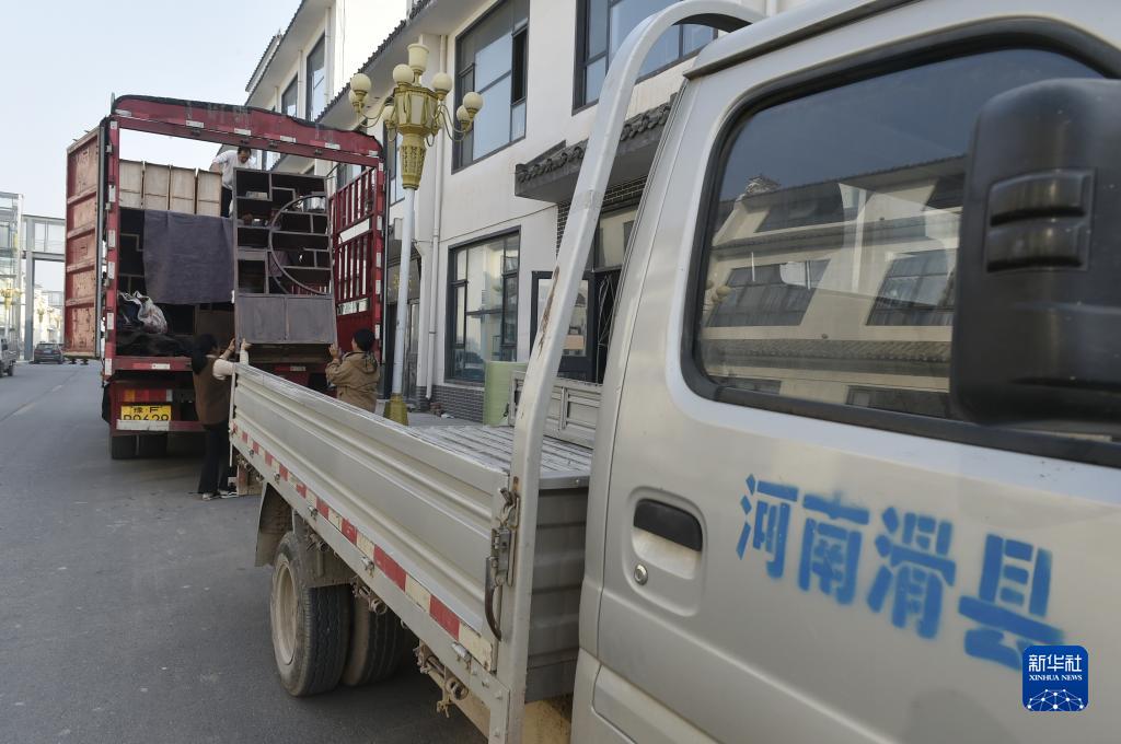 11月22日,在滑縣半坡店古典家具特色小鎮,商戶將家具裝車準備外銷。