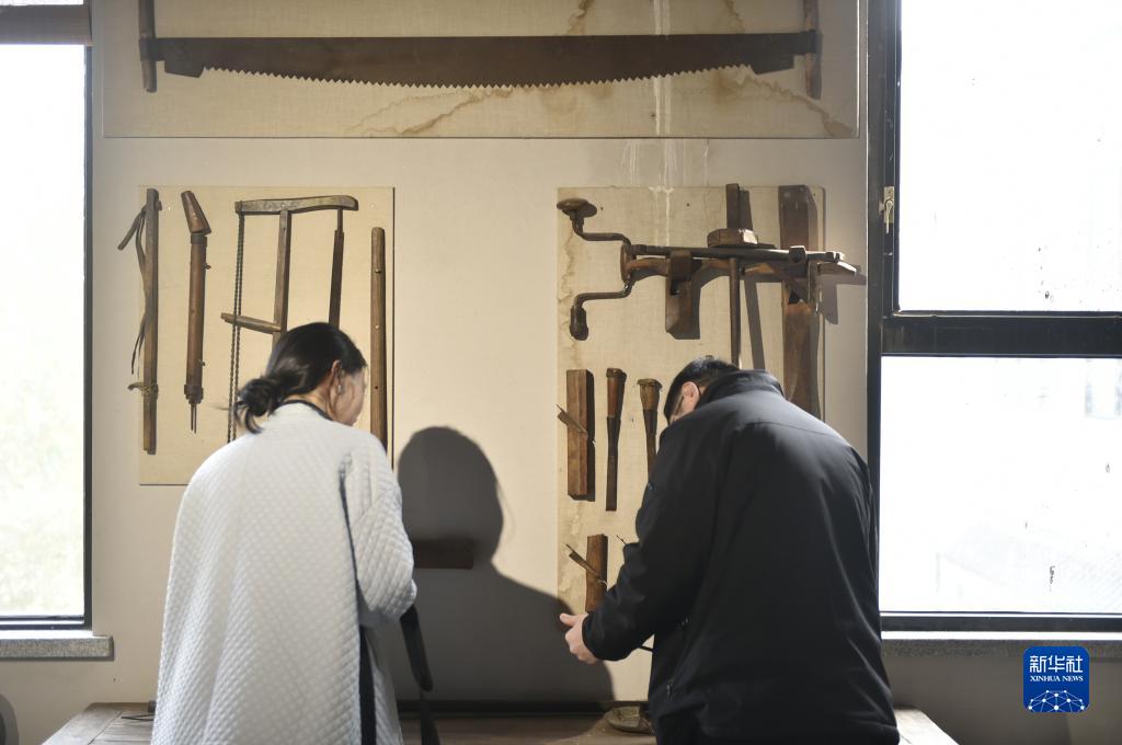 11月22日,來訪者在滑縣半坡店古典家具特色小鎮的家具博物館參觀。