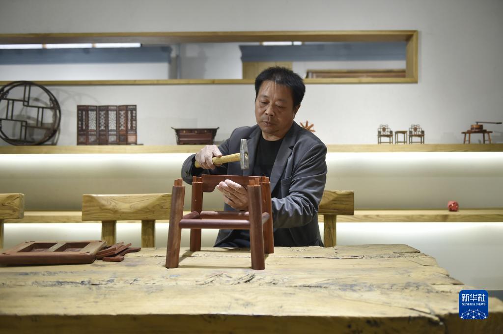 11月22日,在滑縣半坡店古典家具特色小鎮,家具匠人嚴書寶在組裝榫卯結構的木凳。