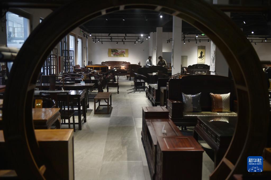 11月22日在滑縣半坡店古典家具特色小鎮拍攝的一家企業的家具展廳。