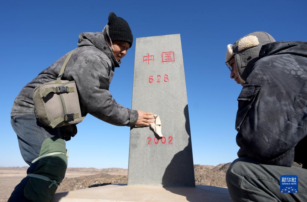 在內蒙古阿拉善左旗烏力吉蘇木溫都爾毛道嘎查,牧民朝勒門格爾勒(左)和兒子溫都蘇擦拭界碑(11月17日攝)。