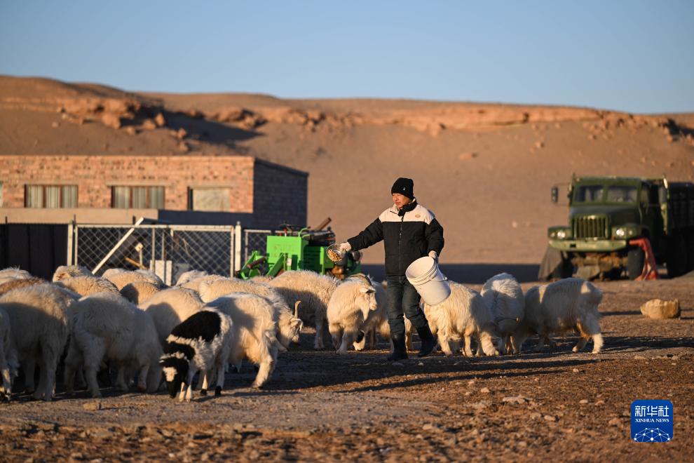 在內蒙古阿拉善左旗烏力吉蘇木溫都爾毛道嘎查,牧民朝勒門格爾勒在喂羊(11月17日攝)。