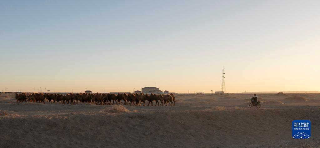 在內蒙古阿拉善左旗烏力吉蘇木溫都爾毛道嘎查,牧民朝勒門格爾勒騎著摩托車放駱駝(11月17日攝)。