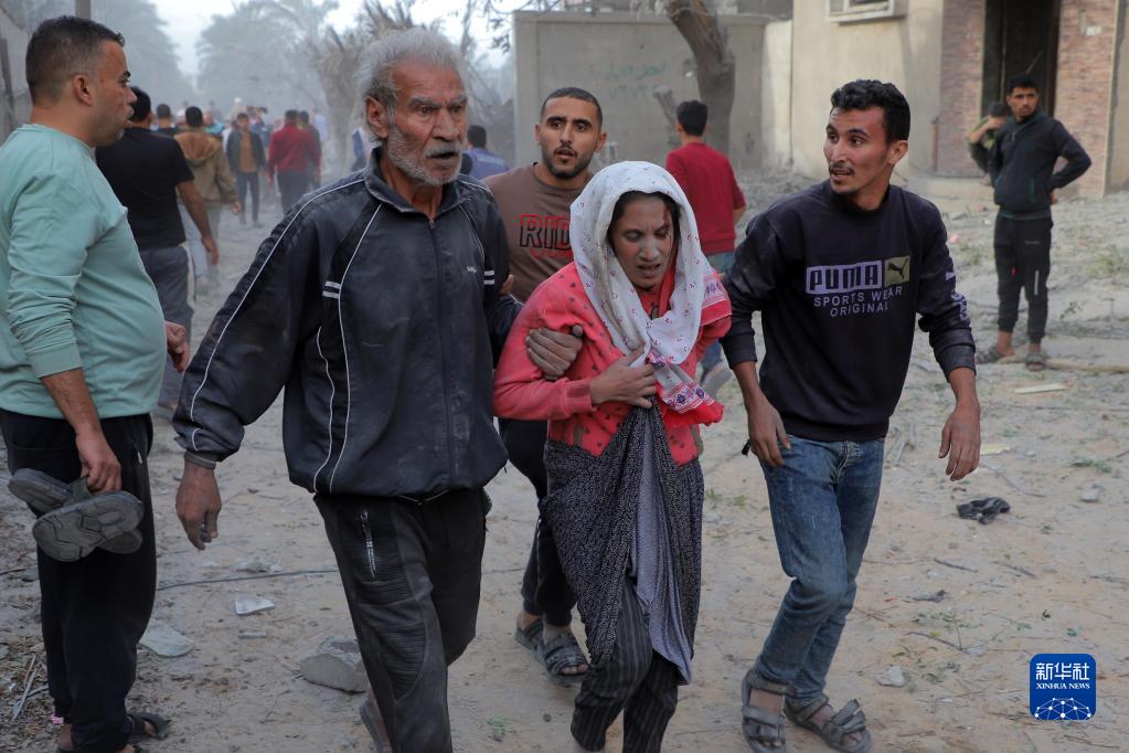 11月22日,在加沙地帶南部城市汗尤尼斯,人們救援以軍空襲后的傷者。