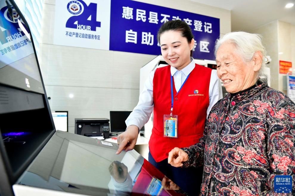 11月23日,在惠民縣政務服務中心,“紅馬甲”服務專員幫助一名老人辦理相關業務。