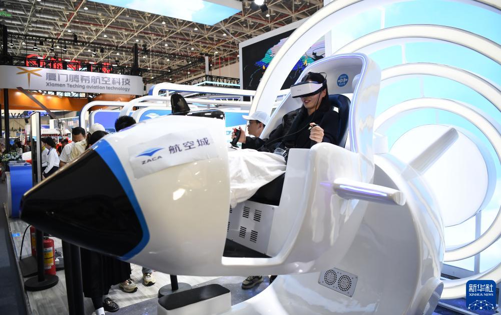 11月23日,觀眾在航展上體驗模擬飛行器。