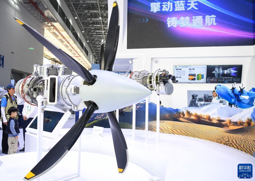 這是11月23日拍攝的中國航發展示的螺旋槳發動機模型。