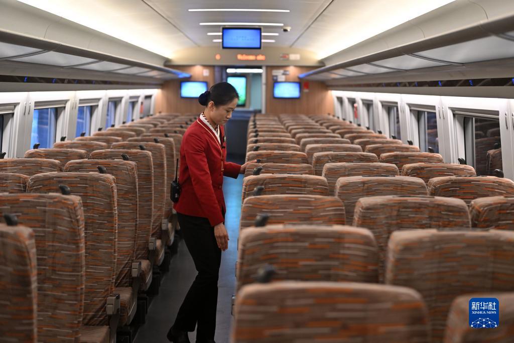 11月23日,客運員在運行試驗車的車廂內巡查。