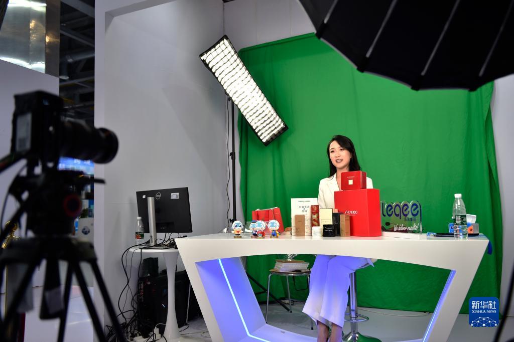 11月23日,在第二屆全球數字貿易博覽會絲路電商館,一名主播進行電商直播。