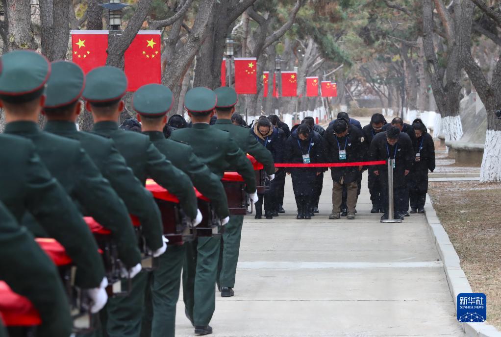 11月23日,沈陽抗美援朝烈士陵園工作人員向殮放志愿軍烈士遺骸的棺槨鞠躬。