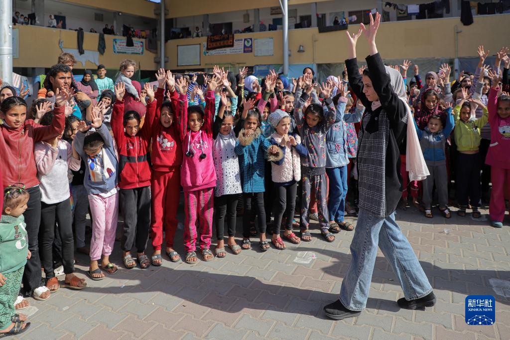 11月23日,在加沙地帶南部城市汗尤尼斯,當地志愿者和兒童進行互動。