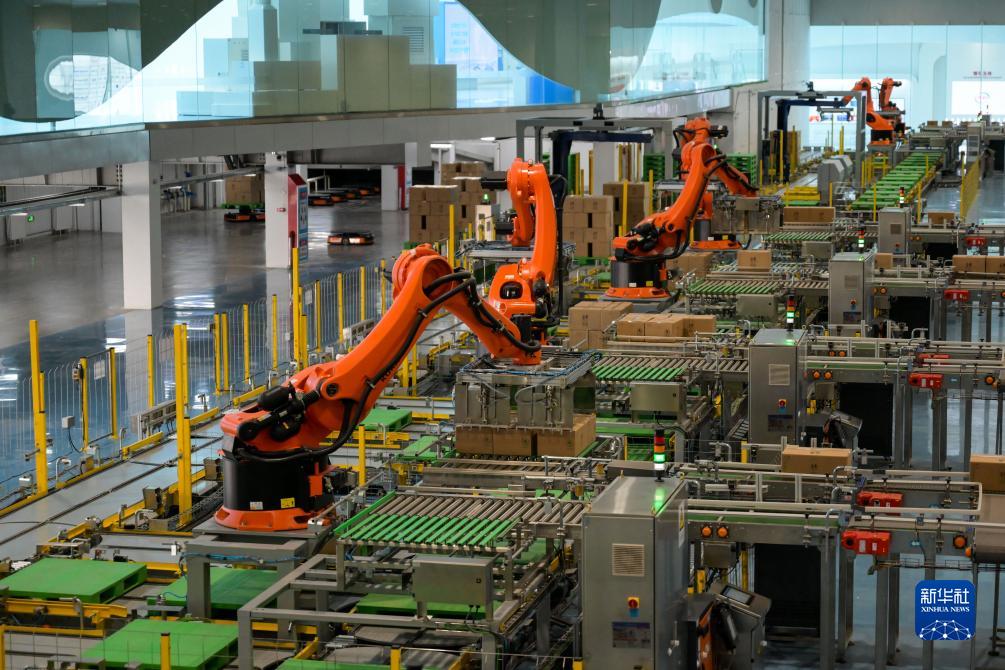 11月23日,在呼和浩特市伊利現代智慧健康谷液態奶全球智造標桿基地,機器人在碼放裝箱的乳制品。