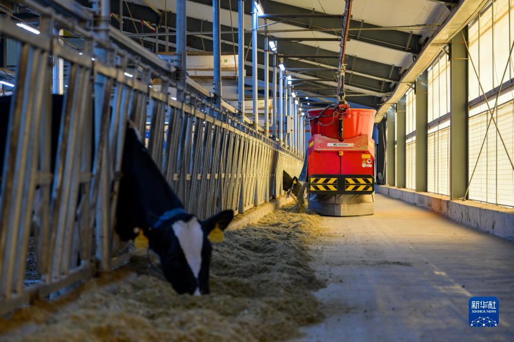 11月23日,在呼和浩特市伊利敕勒川生態智慧牧場,機器人在添加飼料。