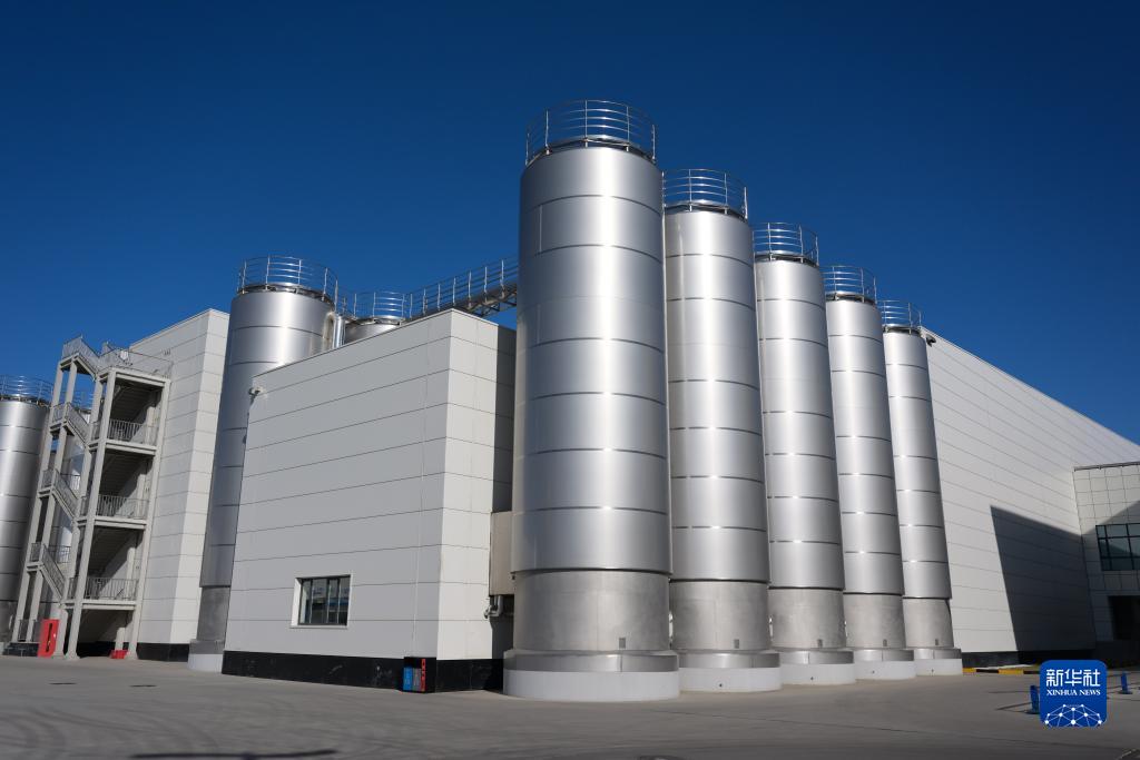 這是11月23日拍攝的呼和浩特市伊利現代智慧健康谷液態奶全球智造標桿基地的儲奶罐。