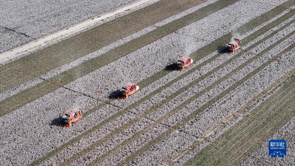 新疆庫爾勒市普惠農場一處棉田,農民駕駛大型采棉機采摘棉花(10月12日攝,無人機照片)。