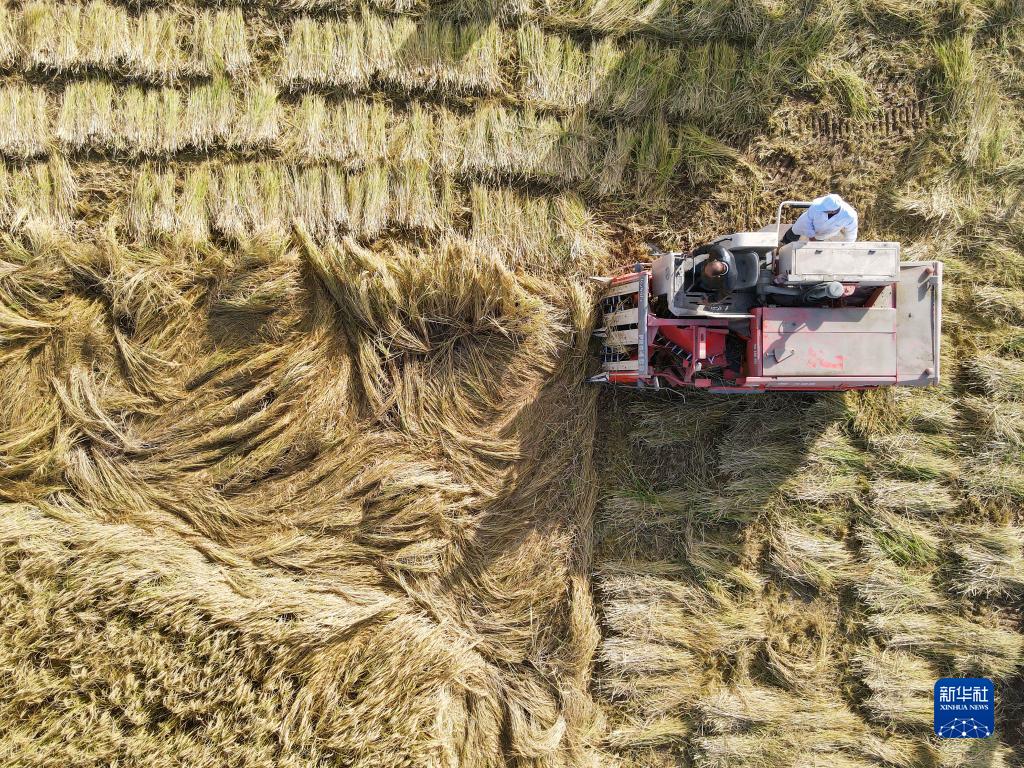 新疆阿拉爾市耐鹽堿水稻測產田塊,人們操作機械收割水稻(10月13日攝,無人機照片)。