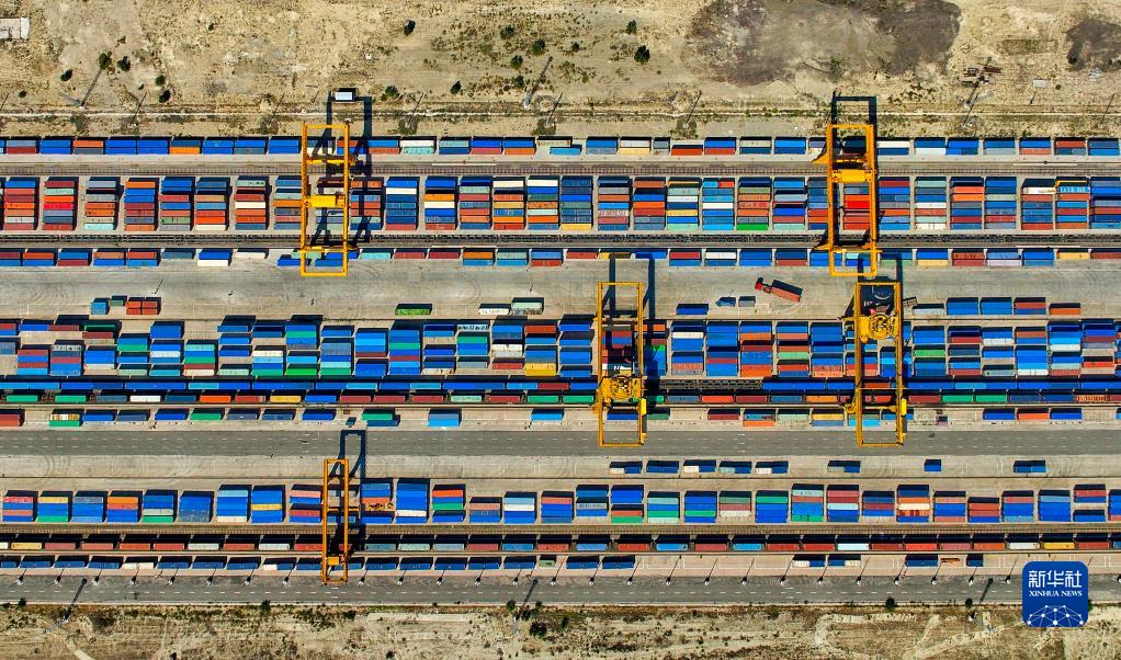 新疆霍爾果斯站換裝庫(9月6日攝,無人機照片)。目前,經霍爾果斯鐵路口岸通行中歐(中亞)班列數量累計超過3.2萬列,班列開行線路累計達80條,輻射境外18個國家、45個城市和地區。
