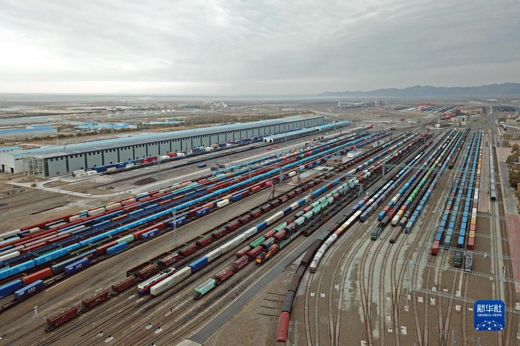 新疆阿拉山口站編組場內集結待發的貨運列車(11月4日攝,無人機照片)。阿拉山口口岸位于新疆博爾塔拉蒙古自治州,毗鄰哈薩克斯坦,是中國連通中亞、直達歐洲的主要運輸通道,在絲綢之路經濟帶核心區建設中發揮了重要作用。