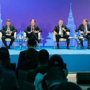 11月22日,在俄羅斯首都莫斯科,俄羅斯工業與貿易部副部長卡里莫夫(右四)參與論壇討論。