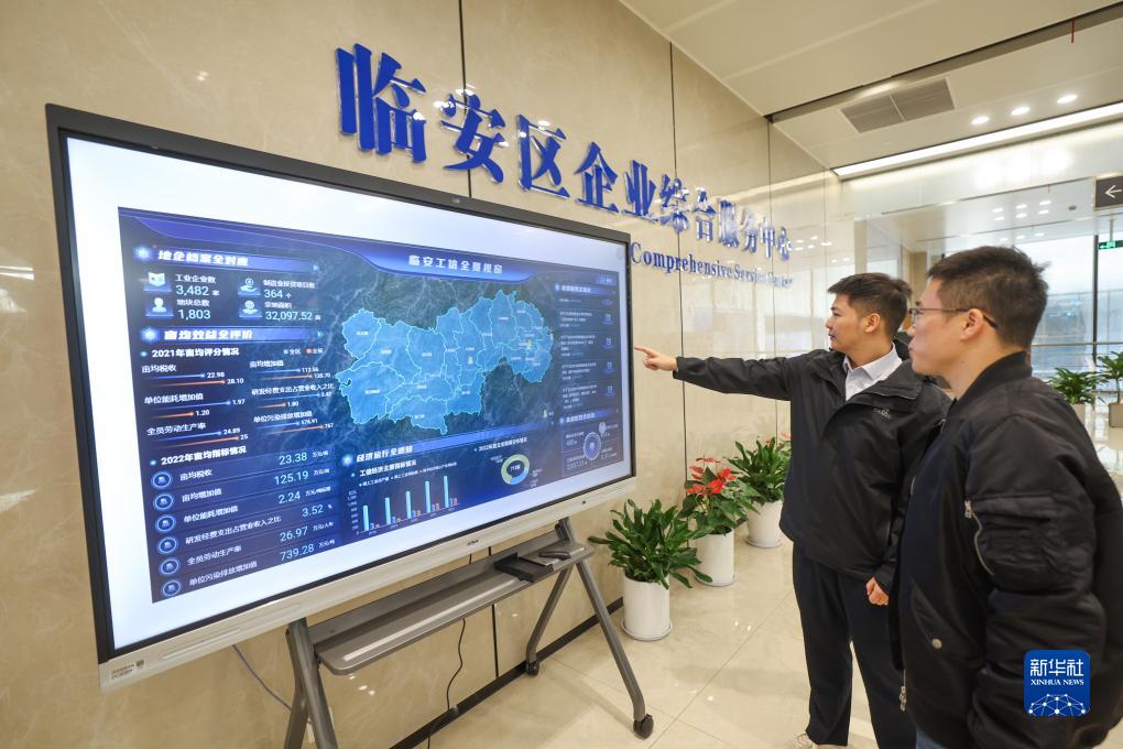 11月24日,臨安區企業綜合服務中心,兩位企業主在電子屏幕前了解臨安企業分布及發展情況。