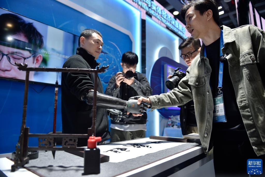 11月23日,在第二屆全球數字貿易博覽會上,觀眾在前沿趨勢館體驗與穿戴智能仿生手的參展人員握手。
