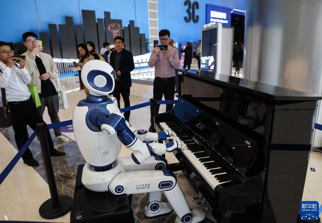 這是11月24日在第二屆全球數字貿易博覽會上拍攝的會彈鋼琴的機器人。