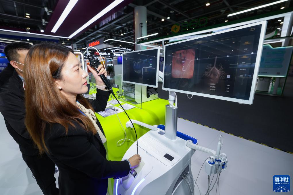這是11月23日在第二屆全球數字貿易博覽會上拍攝的醫用AI實訓模擬系統。