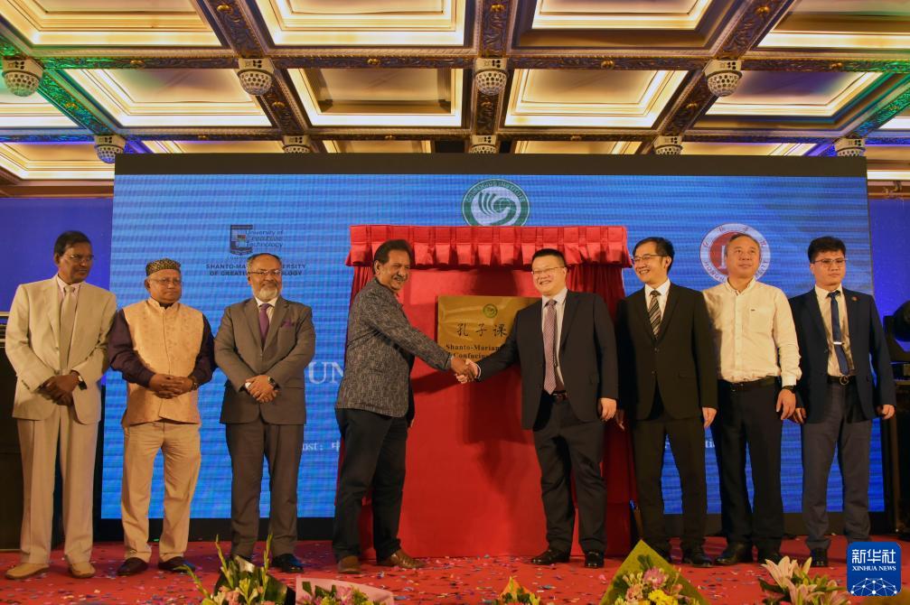 這是11月22日在孟加拉國達卡拍攝的山度·瑪利亞姆—紅河孔子課堂揭牌儀式。