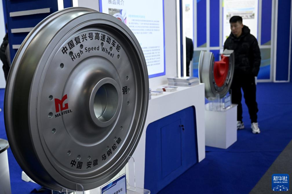 這是11月24日在第三屆國際新材料產業大會展覽上拍攝的中國復興號高速動車輪模型。
