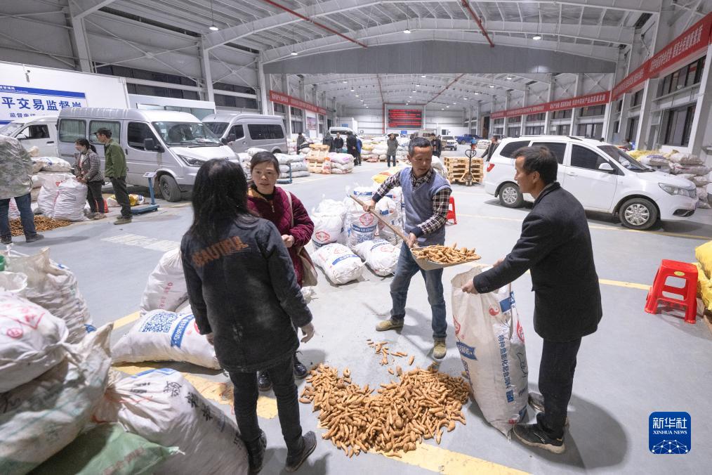 11月23日,在湖北省羅田縣九資河鎮大別山道地藥材產業園鮮貨交易市場,客商在收購藥農的天麻。