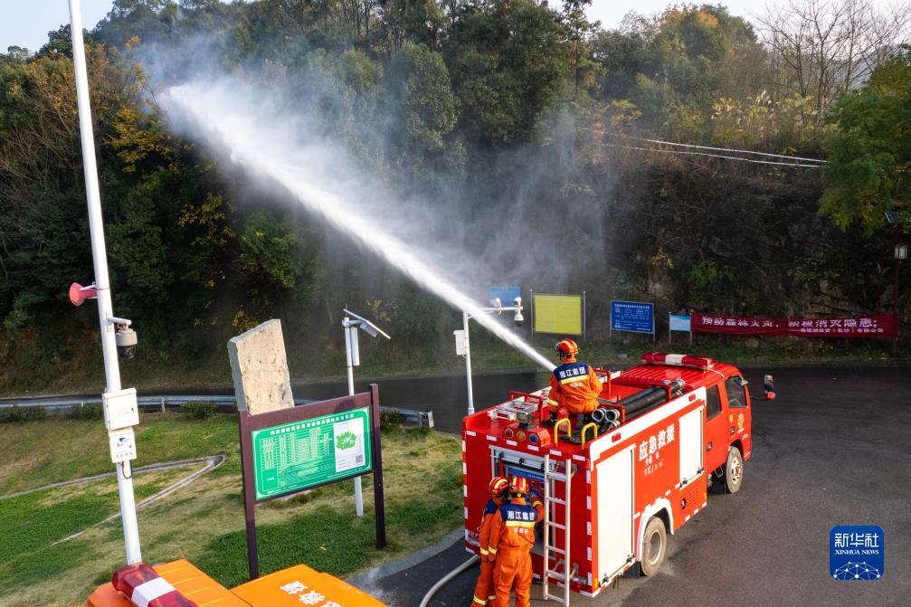 11月24日,在長沙象鼻窩森林公園,應急救援員在演練中向模擬起火點噴水(無人機照片)。