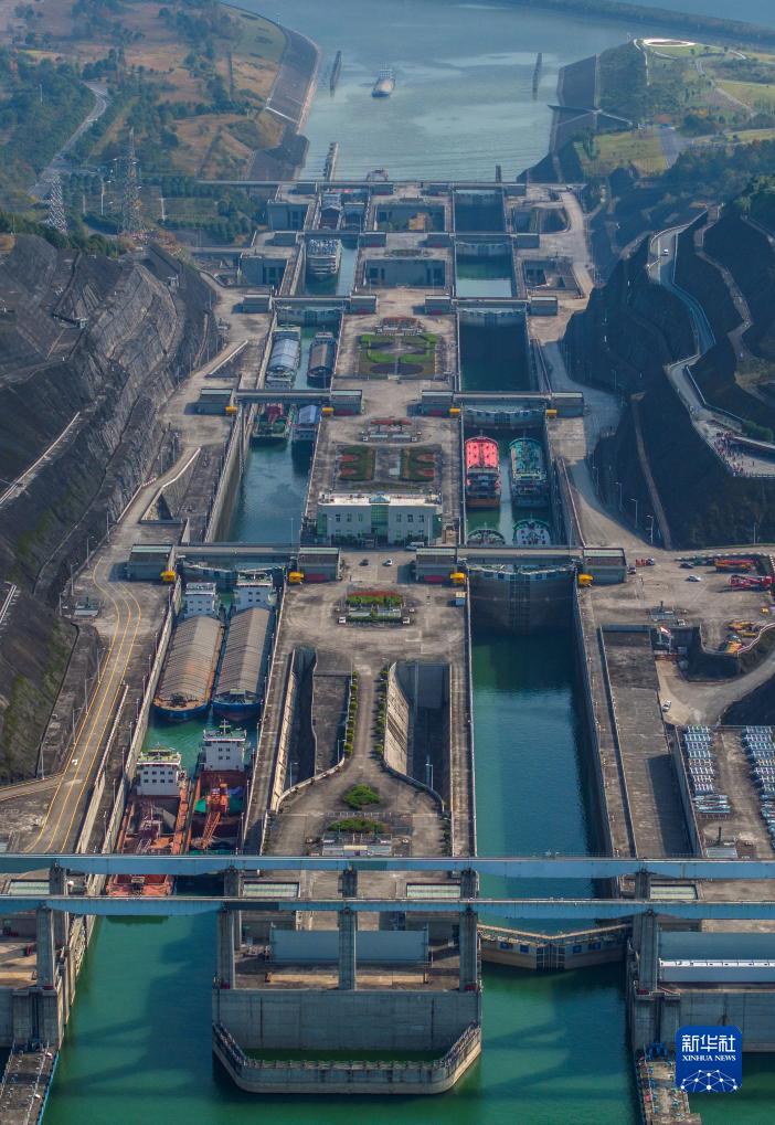 11月24日,在湖北省宜昌市,船舶有序通過三峽雙線五級船閘(無人機照片)。