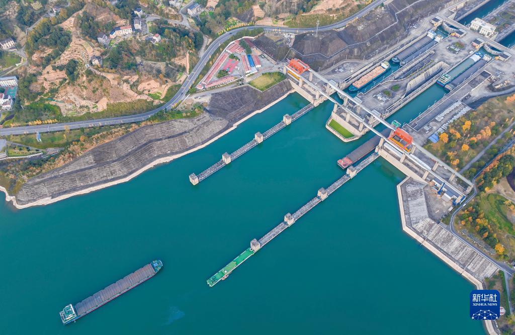 11月24日,船舶有序通過三峽雙線五級船閘(無人機照片)。