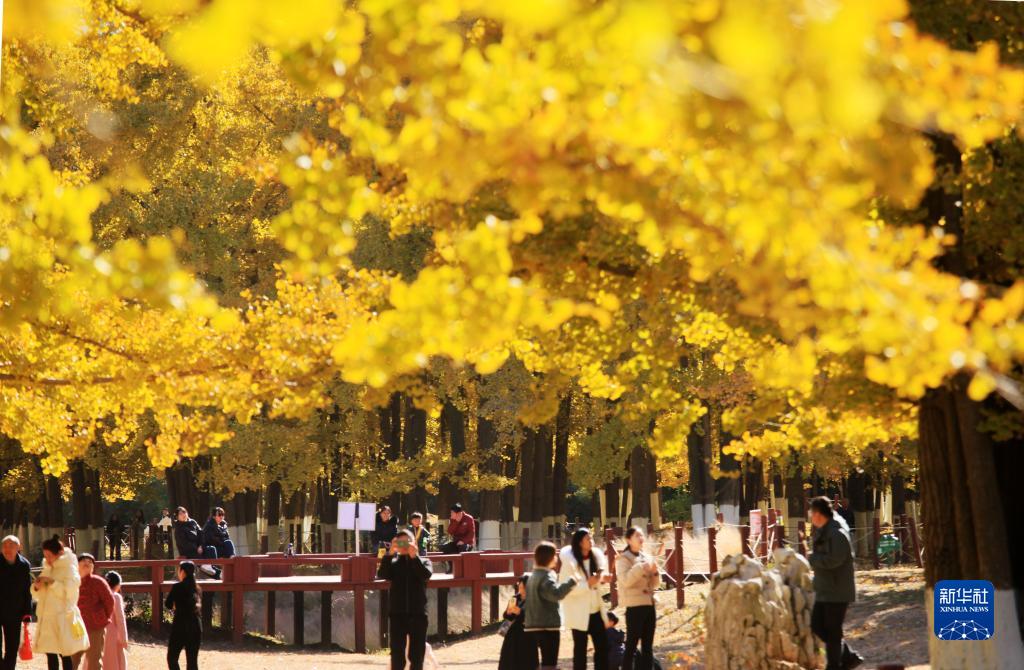 11月24日,游客在山東省臨沂市生生園銀杏林里游玩。