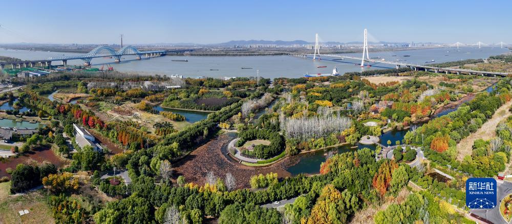 11月24日拍攝的位于江蘇省南京市雨花臺區的三橋濕地公園(無人機全景照片)。