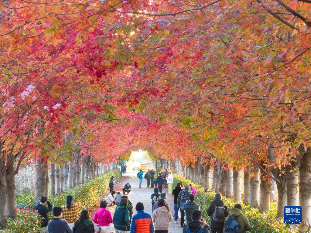 11月24日,游客在江蘇省蘇州市工業園區一處農業園的紅楓大道賞楓(無人機照片)。