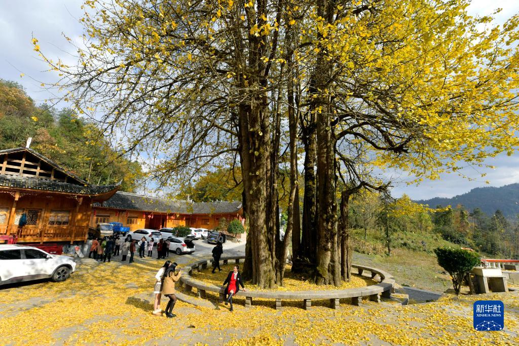 11月23日,游客在湖北省恩施土家族苗族自治州宣恩縣珠山鎮東門關村的古銀杏樹下游玩。