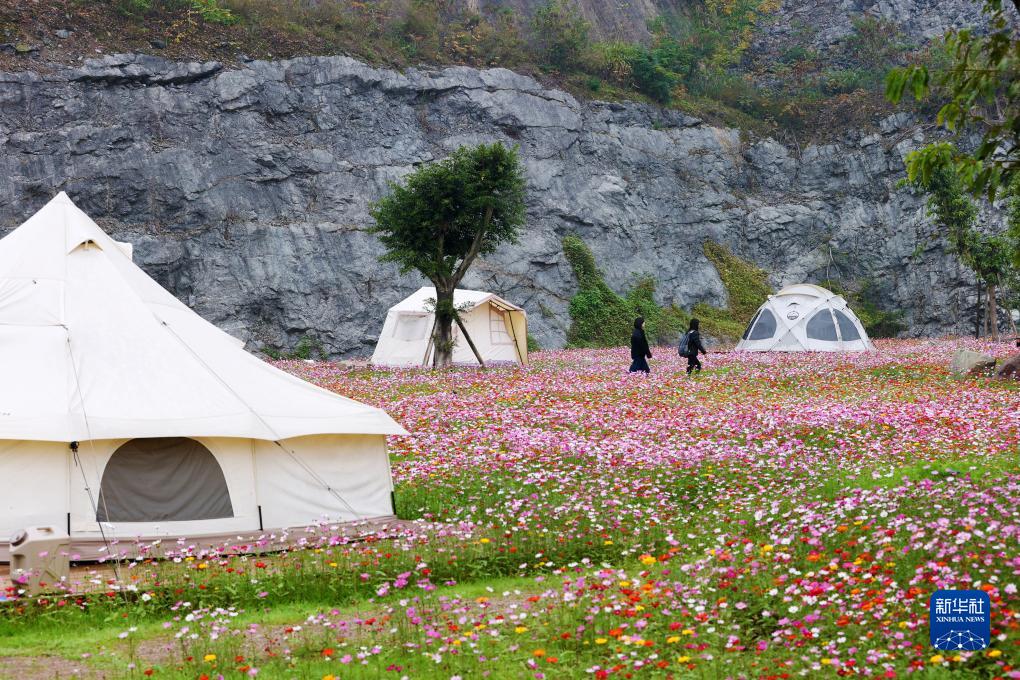 11月23日,游客在重慶市大渡口區跳磴鎮新合村礦山復綠打卡地——六合礦區蒲公英成長酷玩營地的格?;▍^游玩。