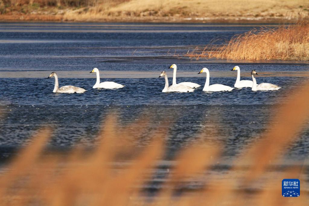 11月24日,幾只遷徙來的白天鵝在甘肅省張掖市甘州區城北郊濕地公園湖水中棲息覓食。