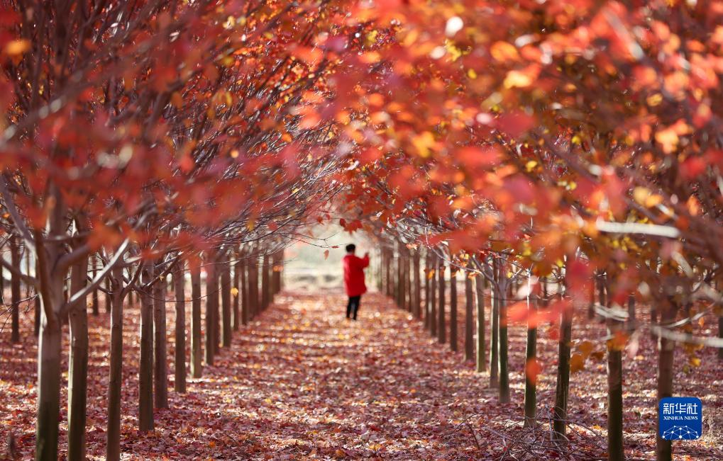 11月24日,在山東省臨沂市郯城縣郯城街道榆林五村一處紅楓林,游人在觀賞楓葉。