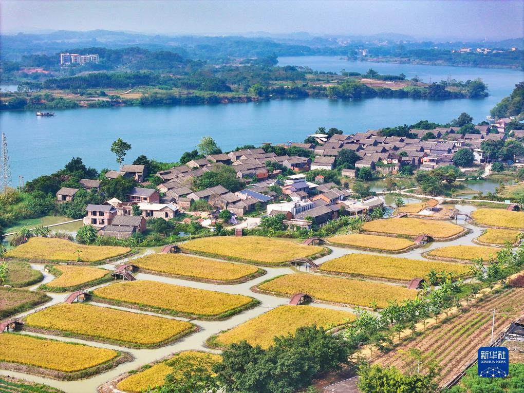 11月23日在廣西南寧市江南區江西鎮拍攝的稻谷金黃的景色(無人機照片)。