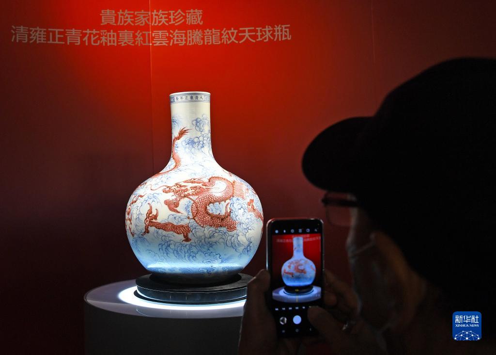 11月24日,在香港會議展覽中心,觀眾拍攝清雍正青花釉里紅云海騰龍紋天球瓶。