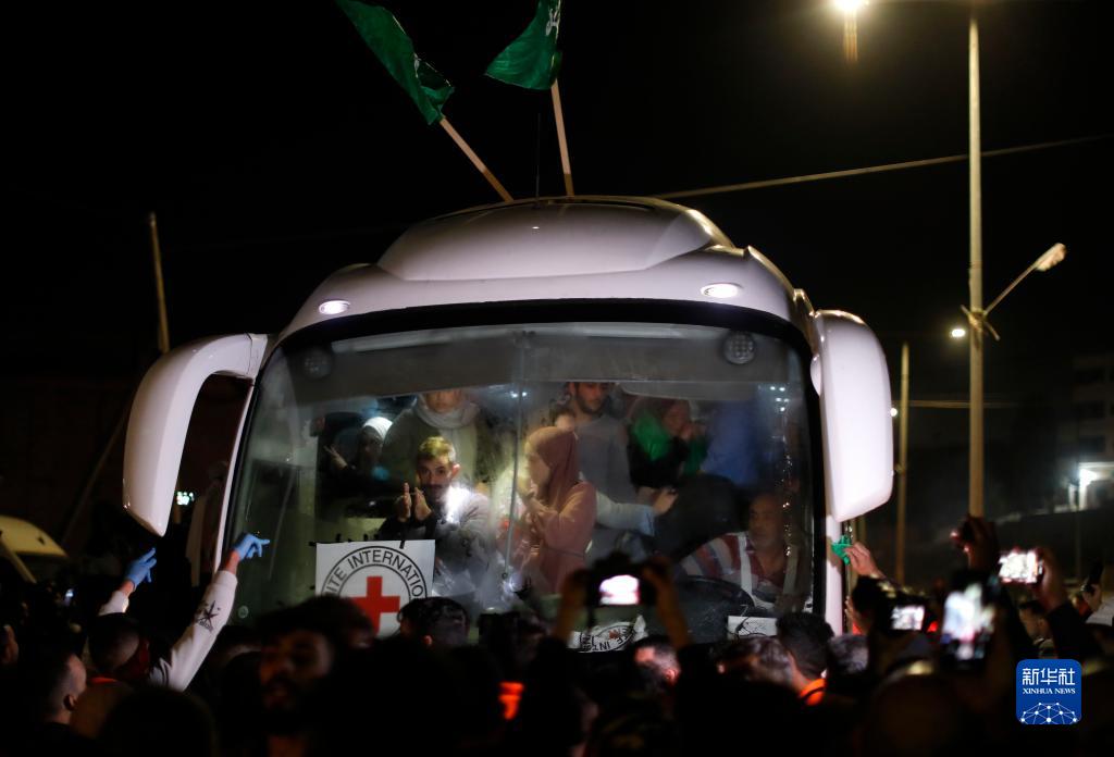 11月24日,在約旦河西岸城市拉姆安拉附近的拜圖尼亞鎮,獲釋的巴勒斯坦人乘車離開。
